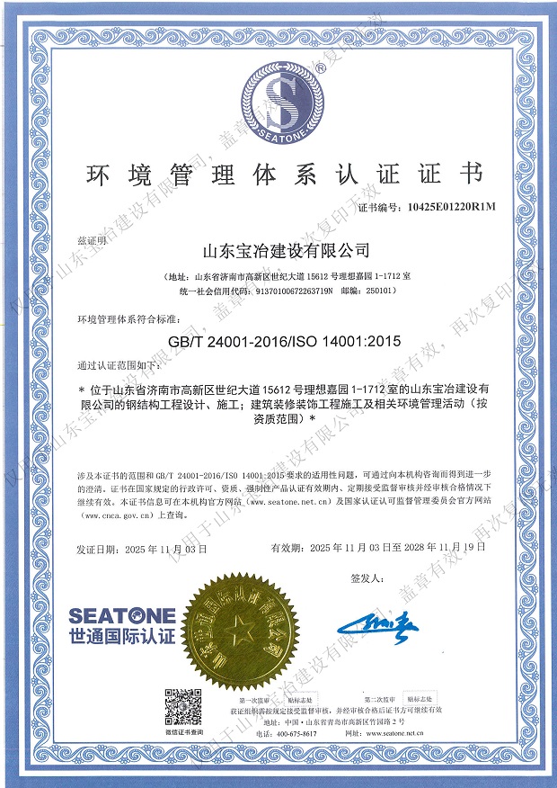 山東寶冶建設有限公司地處山東省濟南市高新技術開發區。經過多年的發展,現已具備建筑施工總承包、電力工程施工總承包、承裝(修、試)電力設施專業承包、鋼結構工程專業承包、特種工程(結構補強)專業承包、建筑裝修裝飾工程專業承包、建筑機電安裝工程專業承包、建筑幕墻工程專業承包、消防設施工程專業承包、防水防腐保溫工程專業承包、輕型鋼結構工程設計專項資質,可承接上述資質承攬范圍內的工程設計與施工。